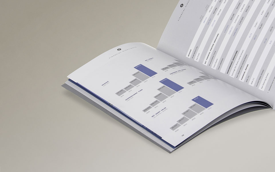 Merging design and concept together, we wanted to represent our client’s exceptional services and convey them to their shareholders. In our design solution, we employed special effect printing of metallic ink and silver foil stamping and also, integrating the blueprints that were requested creatively by optimising it (as seen on the cover) and applying it as a visual element within the dividers. We created a platinum-like cover to exude prestigiousness whilst, retaining the overall consistency to ensure that our client’s needs are met.