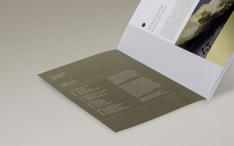 After reviewing Liongold's predicament, our approach was to conceptualise a theme for this report that would communicate and convey a reassuring stance for Liongold’s stakeholder. Strategise, Optimise and Realise were the three key words that we believe were apt in conveying what our client was trying to address in this report. With our understanding of Liongold’s current situation, we ensured the design of this report to be one that was clear and straightforward to effectively communicate our client’s strategies and efforts to arise from its adversities and overcome the challenges ahead.