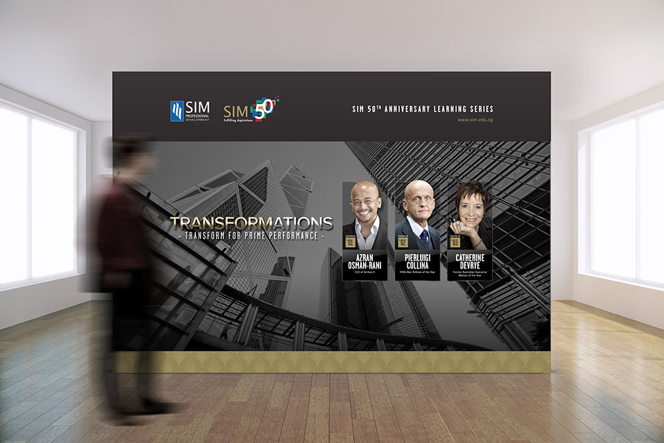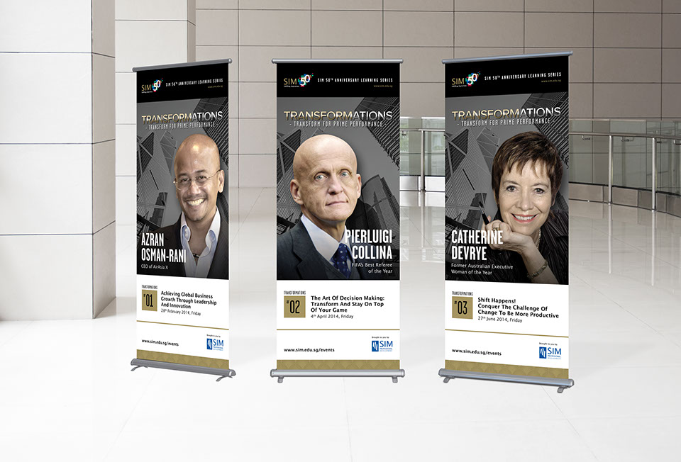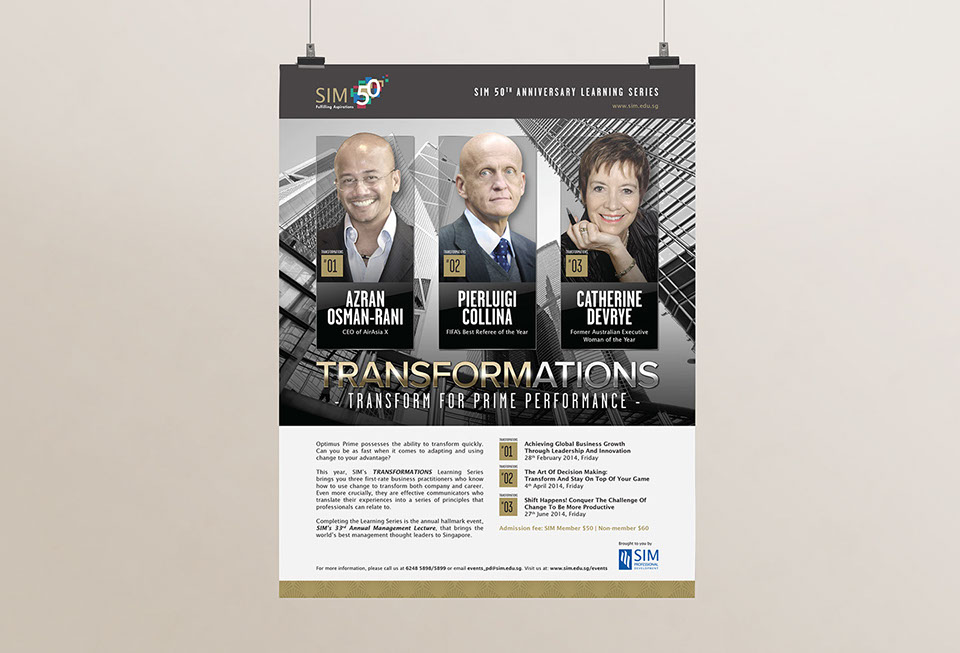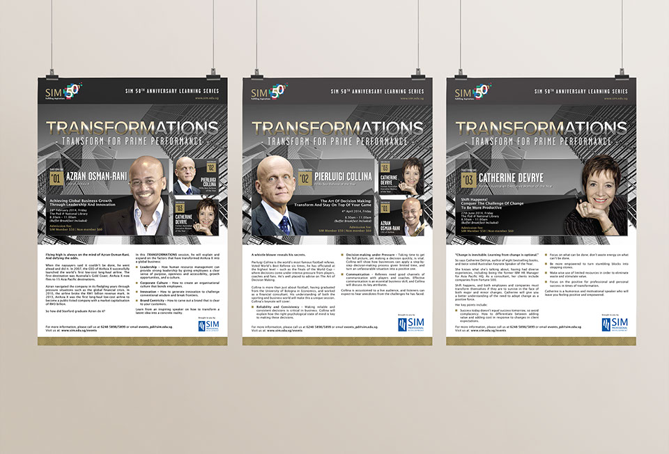 In continued efforts to develop and inspire professional individuals, the Transformations Learning Series - an initiative by SIM, seeks to reach out to interested participants who are keen to hear from global key speakers about their business and career successes. We were asked to design print collaterals that would retain SIM’s brand language but yet, market them in a prominent light. Executed in a modern and bold manner, the key was to standout amongst conventional business posters and place emphasis on the prestigiousness and scale of the event while, retaining its corporate and professional outlook.